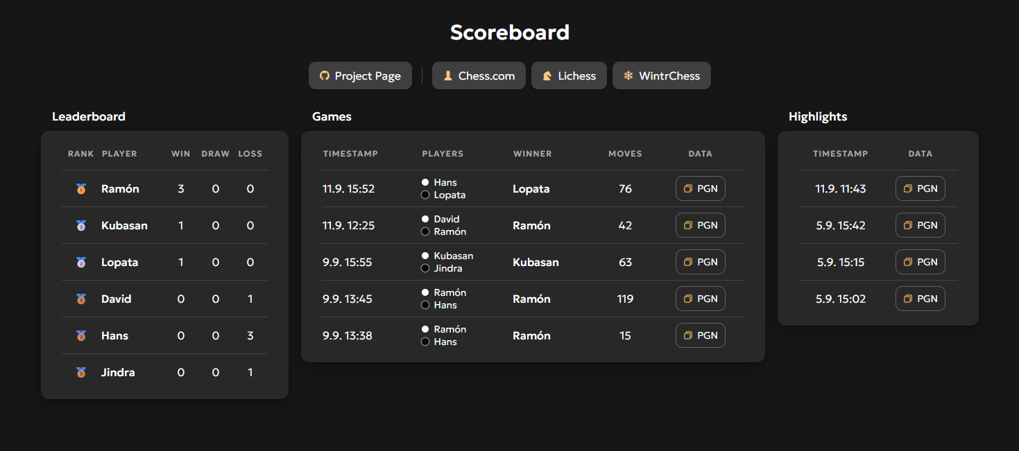 This Astro page shows a leaderboard and an archive of the played games. The PGNs of these games can be put into third-party chess analyzers to figure out who made the first blunder or how many checkmates were missed.